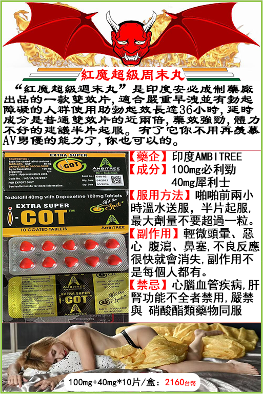 「紅魔超級週末丸」是印度安必成制藥廠出品的 款雙效片,適合嚴重早洩並有勃起障礙的人群使用 助勃起效長達36小時,延時成分是普通雙效片的近 兩倍,藥效強勁,體力不好的建議半片起服。有了 它你不用再羨慕AV男優的能力了,你也可以的。